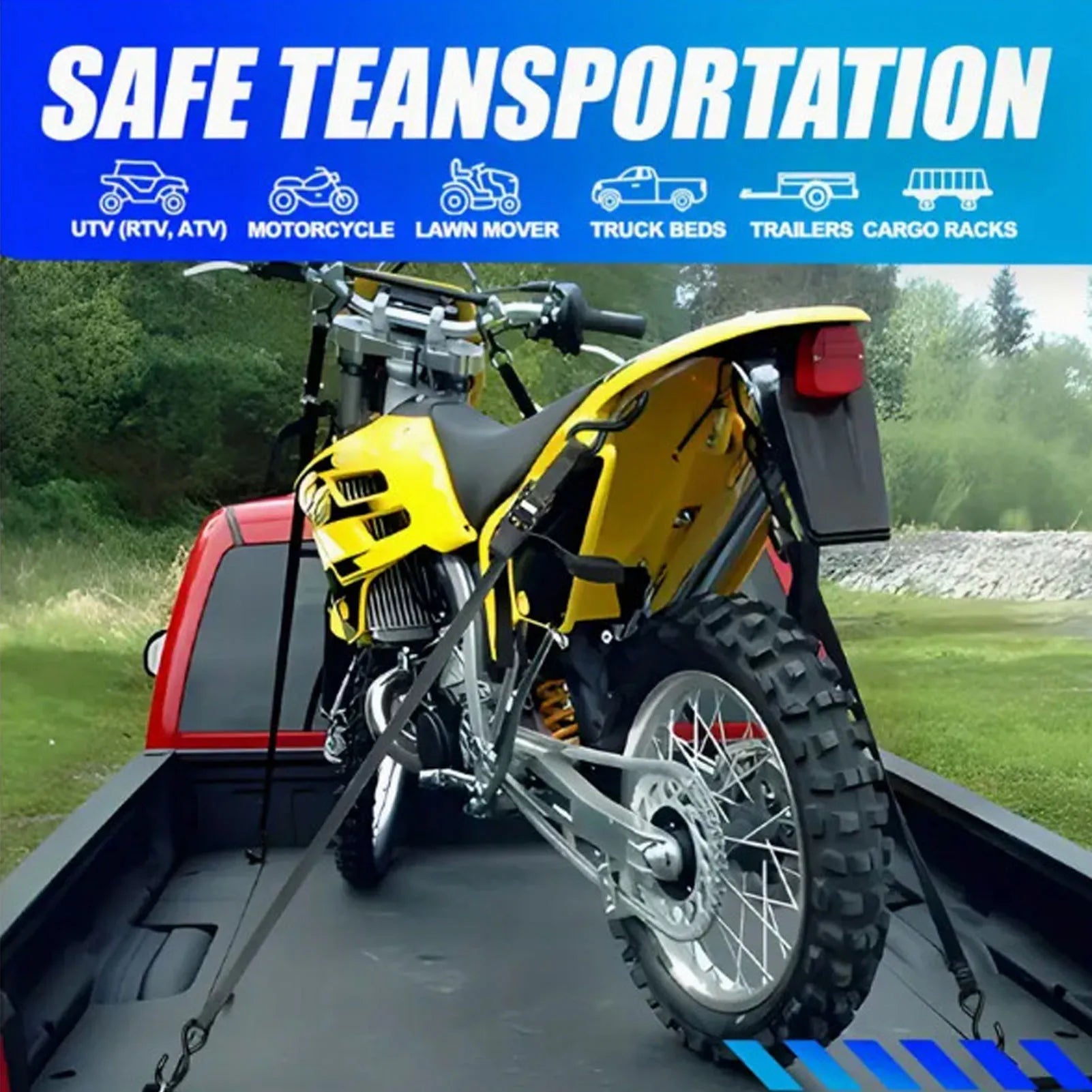 Soporta fuerzas de rotura elevadas diseñadas para motos, ATVs y cargas en remolque bajo uso normal. Ideal para asegurar repuestos, cajas y equipos durante viajes offroad y rutas diarias.